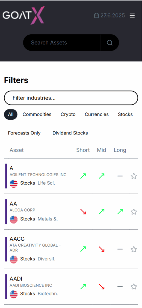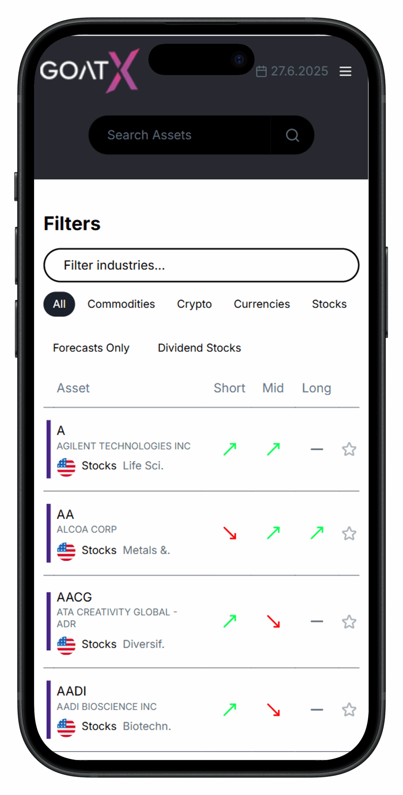 GoatX bietet Ihnen klare Einblicke in das Chancen-Risiko-Verhältnis von über 5000 Aktien, 20 Rohstoffen und 5 ausgewählten Kryptowährungen.